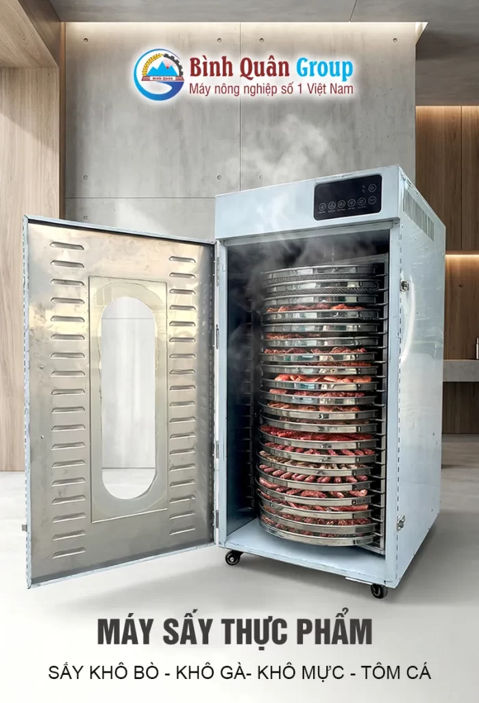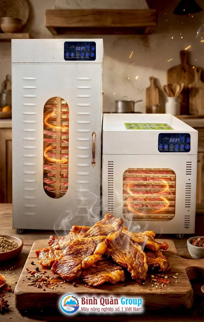 Thay vì dùng chảo hay phơi nắng như cách làm bò khô truyền thống, nhiều gia đình và hộ kinh doanh hiện nay ưu tiên sử dụng máy sấy thực phẩm Bình Quân Group.