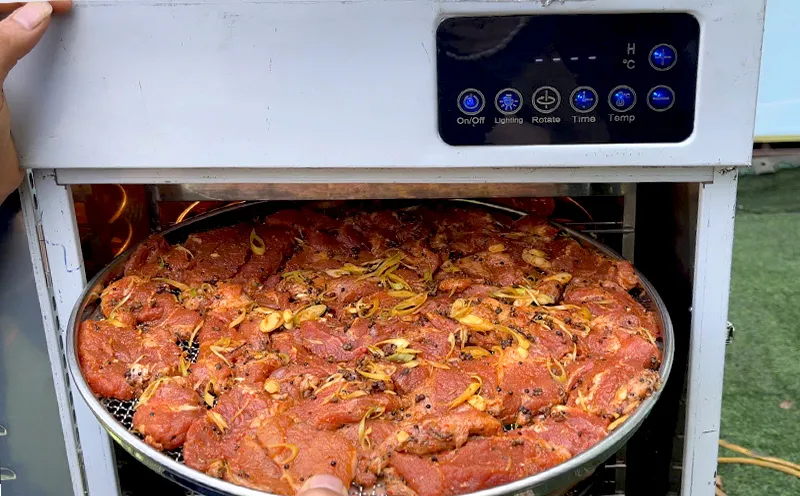 Sau khi thịt đã thấm đẫm gia vị, công đoạn quan trọng nhất trong cách làm bò khô tại nhà chính là sấy khô, Để thành phẩm có màu sắc đẹp, khô đều từ trong ra ngoài mà vẫn giữ được vị ngọt tự nhiên, việc kiểm soát nhiệt độ là yếu tố tiên quyết