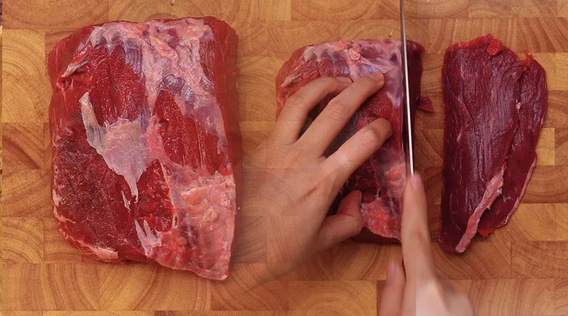 - Thái dọc theo thớ thịt để miếng bò khô có độ dai, không bị vụn và có thể xé sợi đẹp mắt