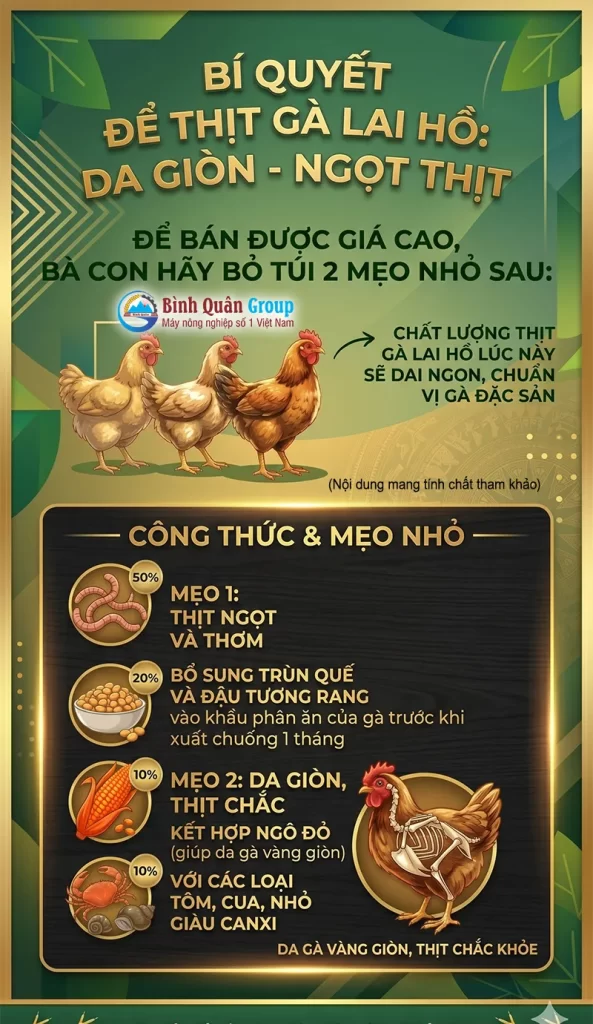 Áp dụng đúng kỹ thuật phối trộn thức ăn và quy trình chăm sóc không chỉ giúp đàn gà lai Hồ chân to – đẹp mã – nhanh lớn mà còn đảm bảo lợi nhuận tối đa nhờ giảm chi phí đầu vào. Hy vọng bài viết đã cung cấp cho bà con những thông tin hữu ích