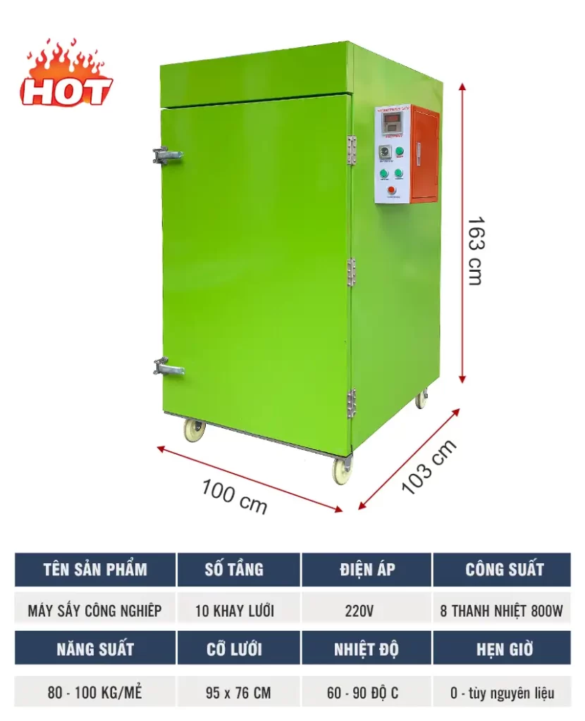 - Thể tích 900 lít gồm 10 khay sấy chữ nhật kích thước lớn