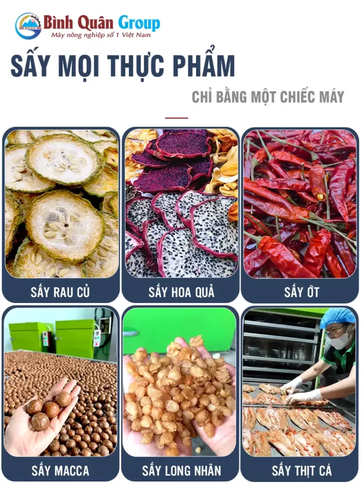 - Máy sấy đa năng: sấy mọi thực phẩm từ sấy thịt cá, sấy hoa quả, sấy macca..