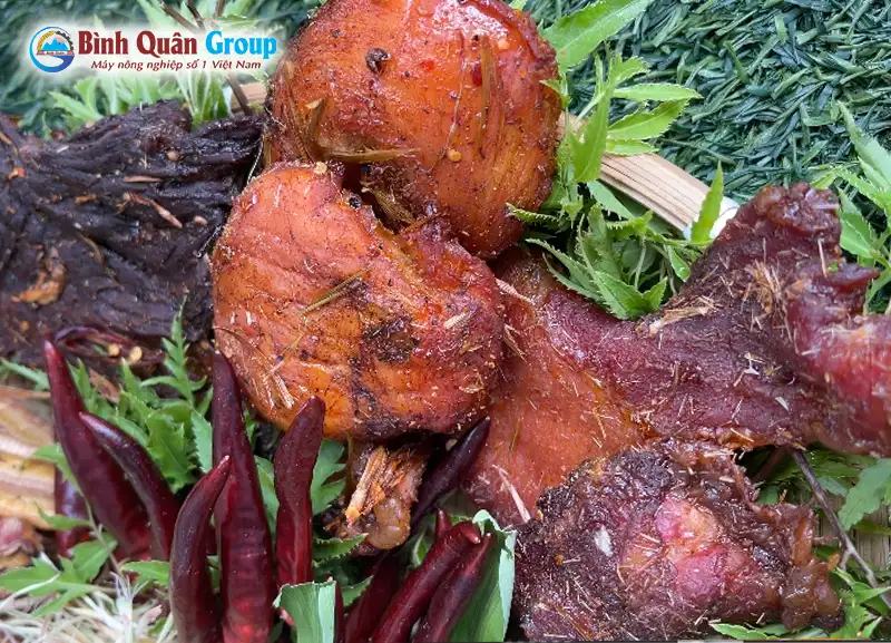 - Ướp gia vị và sấy khoảng từ 80-90 độ C giúp thịt khô đều nhưng không co rút quá mạnh