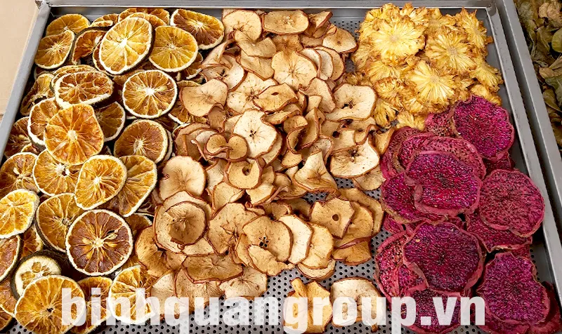 - Hoa quả đến ráo nước rồi dàn đều ra khay nướng rồi cho vào tủ sấy