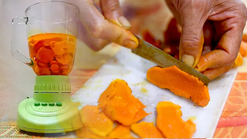 Bước 2: Cho phần nghệ đã cắt lát vào máy xay cùng chút nước sạch, xay đến khi thu được hỗn hợp thật nhuyễn